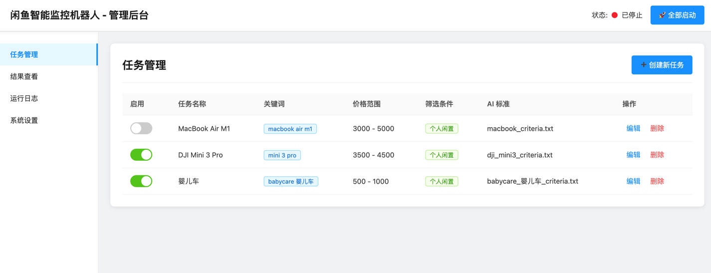 - 可视化编辑: 在表格中直接修改任务参数,如关键词、价格范围等。