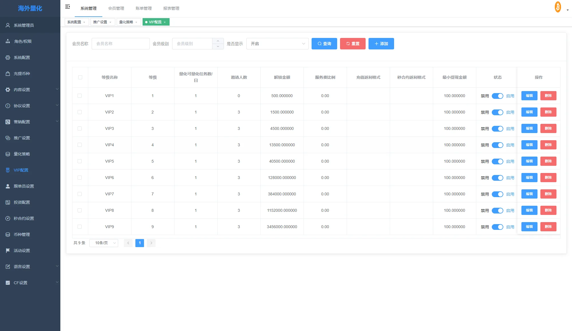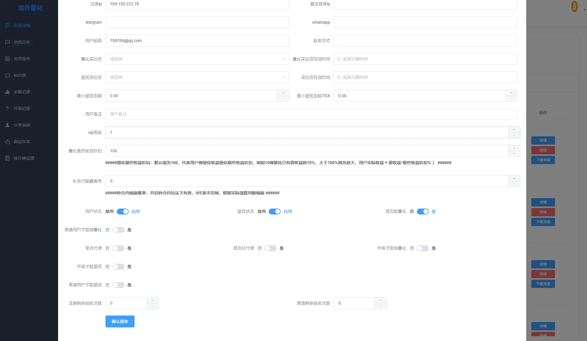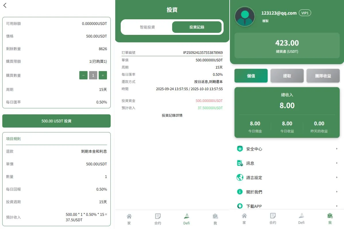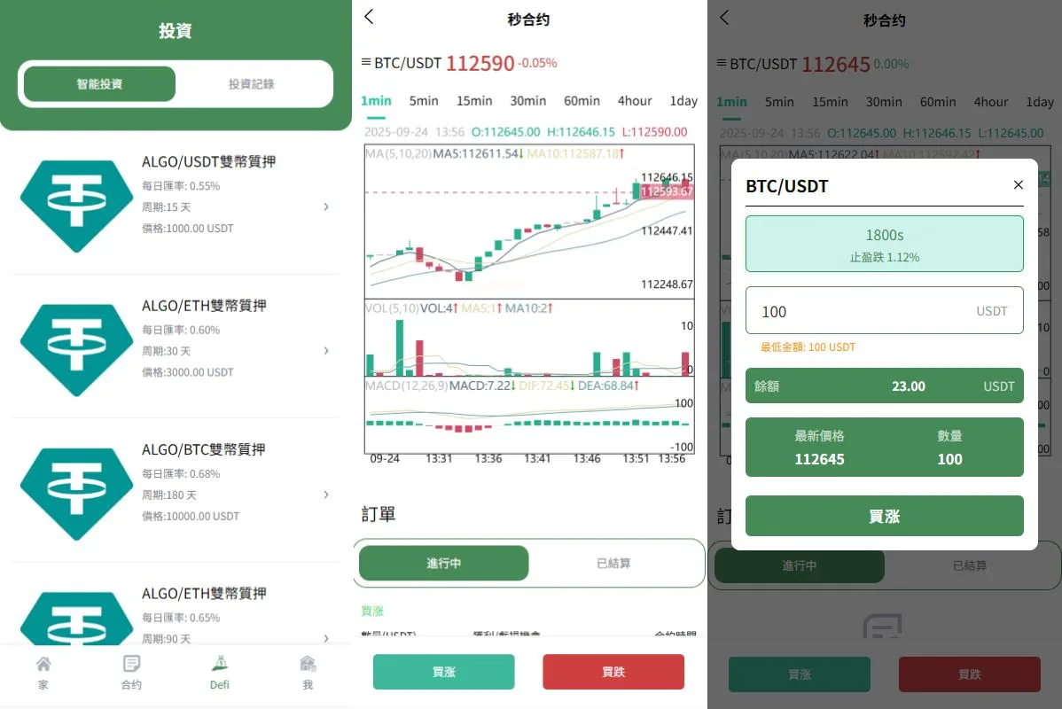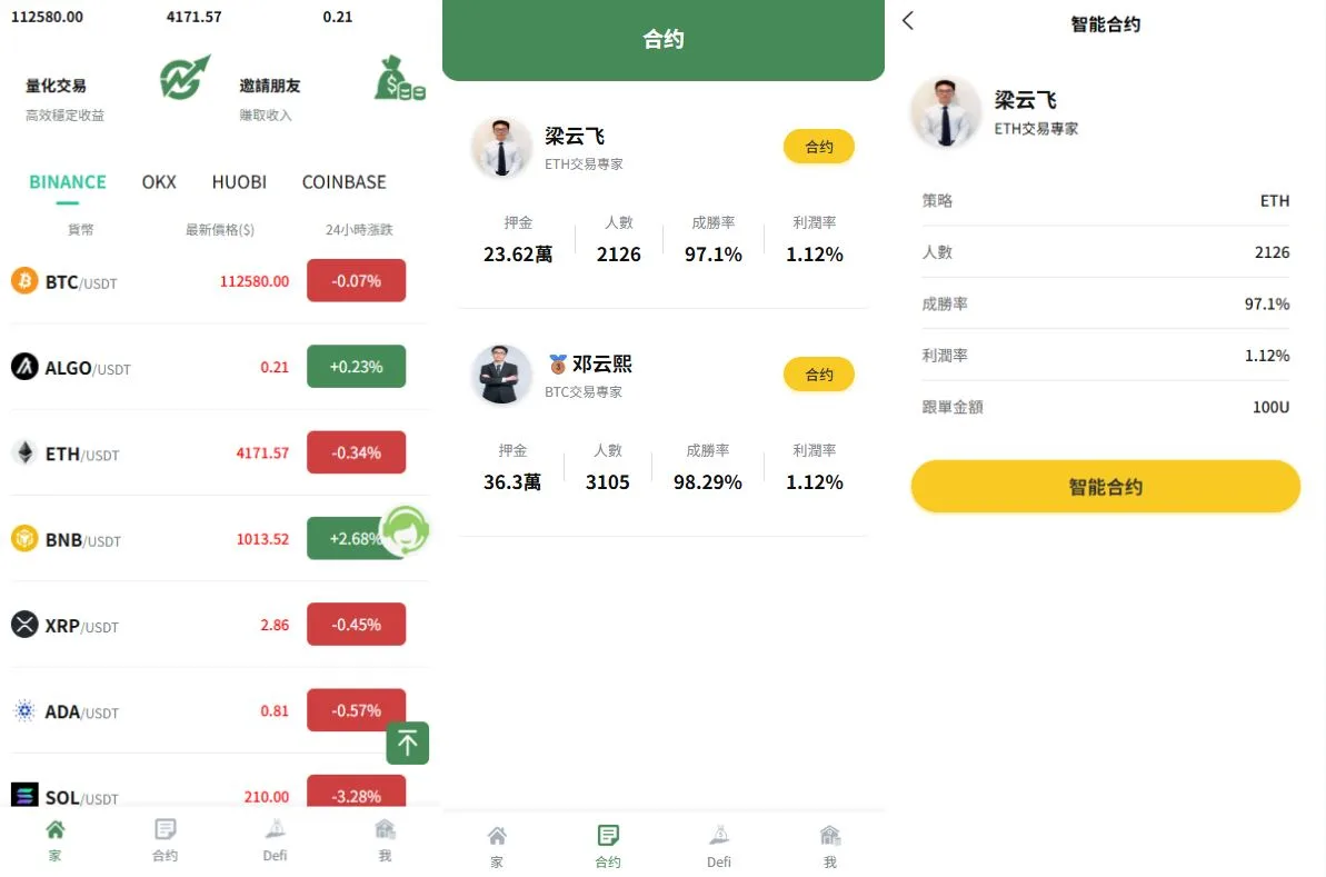 系统功能:秒合约交易,跟单交易,量化交易,Defi投资,三级分销等功能